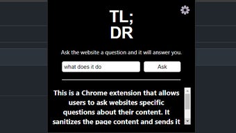 La extensión de Chrome TLDR mejora la navegación web al permitir a los usuarios hacer preguntas específicas sobre el contenido de cualquier sitio web. Esta herramienta está diseñada para agilizar la recuperación de información, siendo particularmente útil para aquellos que buscan respuestas rápidas sin tener que filtrar textos largos. La extensión es gratuita, proporcionando una experiencia fluida para los usuarios de Chrome que desean interactuar de manera más activa con el contenido en línea.